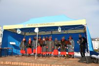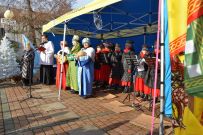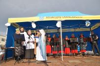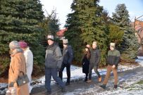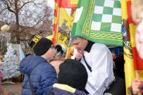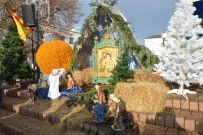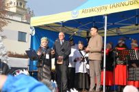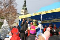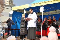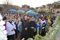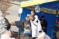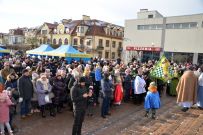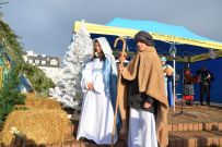 Pogoda była sprzyjająca orszakowi nie tak jak w latach poprzednich toteż kierując się w stronę Placu Bartosza Głowackiego szło się nam wesoło, ze śpiewem kolęd na ustach, wymachując chorągwiami. Tam połączyliśmy się z orszakami z parafii pod wezwaniem Świętej Barbary, Chrystusa Króla i Matki Bożej Nieustającej Pomocy. Przywitała nas organizatorka orszaku Pani Joanna Szmuc a nasz św. Józef i św. Maryja stanęli przy szopce. Ministranci i bielanki umiejscowili się po prawej stronie namiotu dzierżąc w dłoniach chorągwie. Oddaliśmy pokłon Świętej Rodzinie a ksiądz dziekan Adam Marek zawierzył miasto i mieszkańców Tarnobrzega opiece Matki Bożej Dzikowskiej. O godz. 12:00 została odmówiona modlitwa Anioł Pański i wspólne zaśpiewano kilka kolęd.