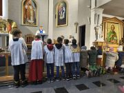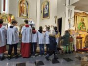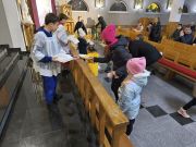 Liturgiczna Służba Ołtarza po Mszy św. rozdała dzieciom plansze, na które naklejać będą w kolejnych dniach obrazki.