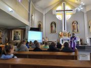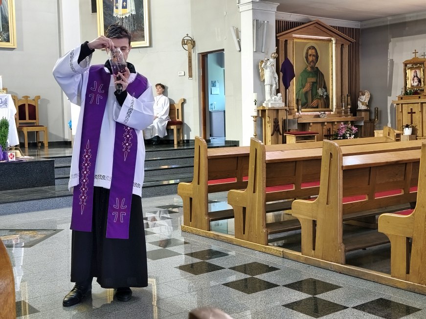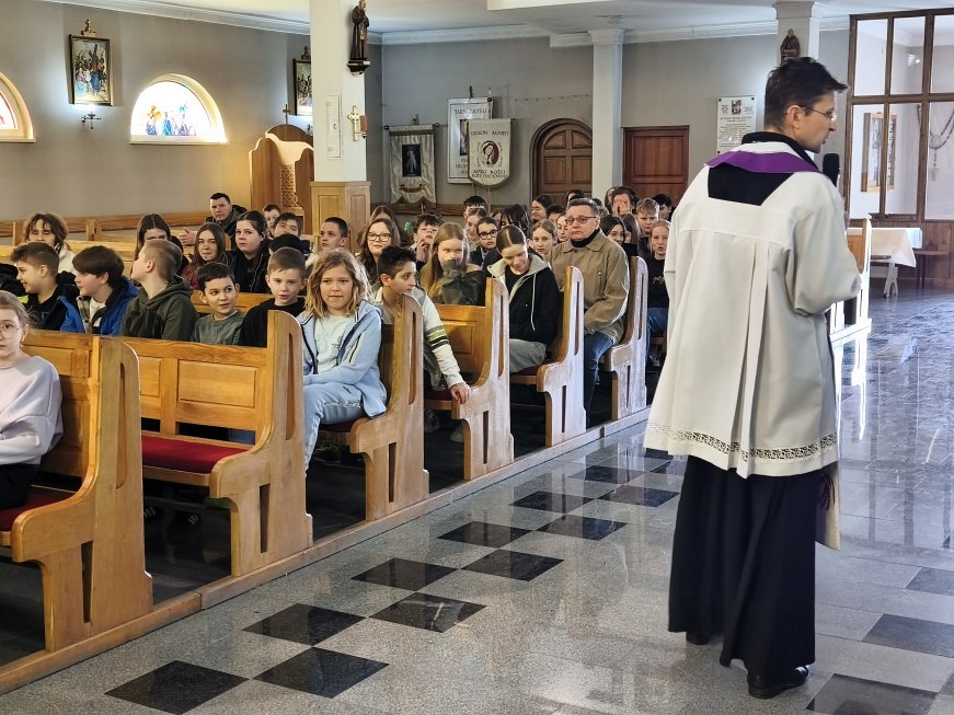 We wtorek 24 marca 2026 roku na godz. 10.00 do kościoła przyszli uczniowie klas od IV do VIII szkoły podstawowej na swoje drugie spotkanie z ks. dr Konradem Fedorowskim. Na początku spotkania ksiądz rekolekcjonista przekazał młodzieży więcej informacji o świętym Carolu Acutisie. O Jego życiu, Jego wierze, przesłaniach i wskazówkach.
