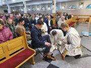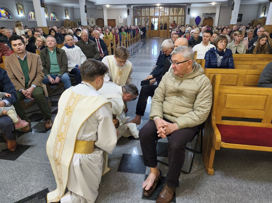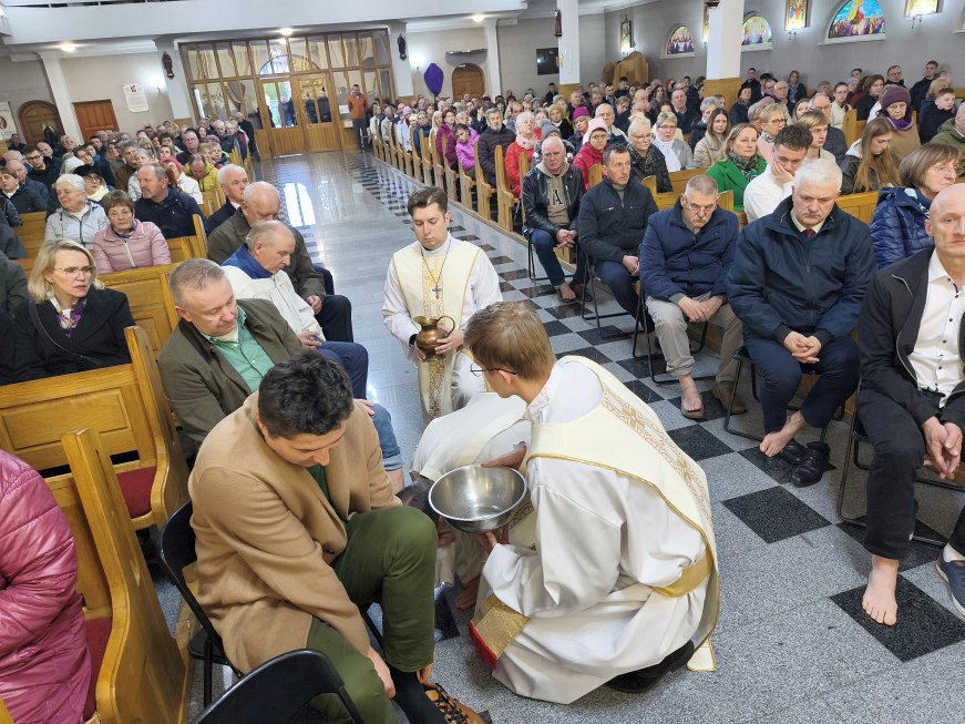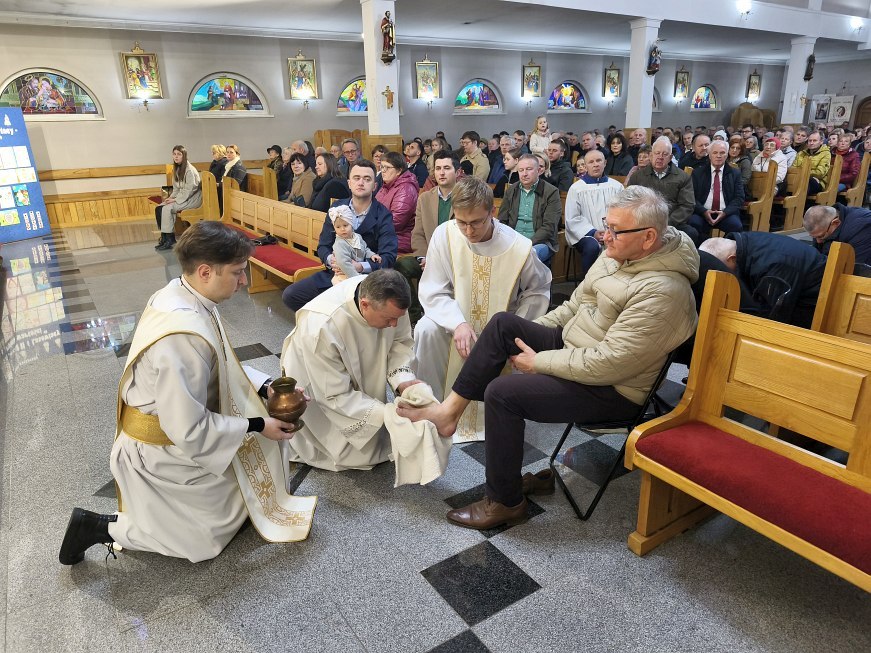 W Wielki Czwartek Jezus pozostawił nam nowe przykazanie miłości: „Miłujcie się wzajemnie, jak Ja was umiłowałem”. Bardzo ważny i pełen pokory w czasie Mszy Wieczerzy Pańskiej był gest umycia nóg 12 mężczyznom przez księdza proboszcza Jana tak jak Jezus umył nogi Apostołom. Był to gest miłości, miłości do końca! Bo umycie nóg nie jest tylko gestem pokory, ale konkretną szkołą miłości – miłości, która staje się służbą wobec drugiego człowieka: w domu, w rodzinie, we wspólnocie, wobec słabych, chorych i potrzebujących.
