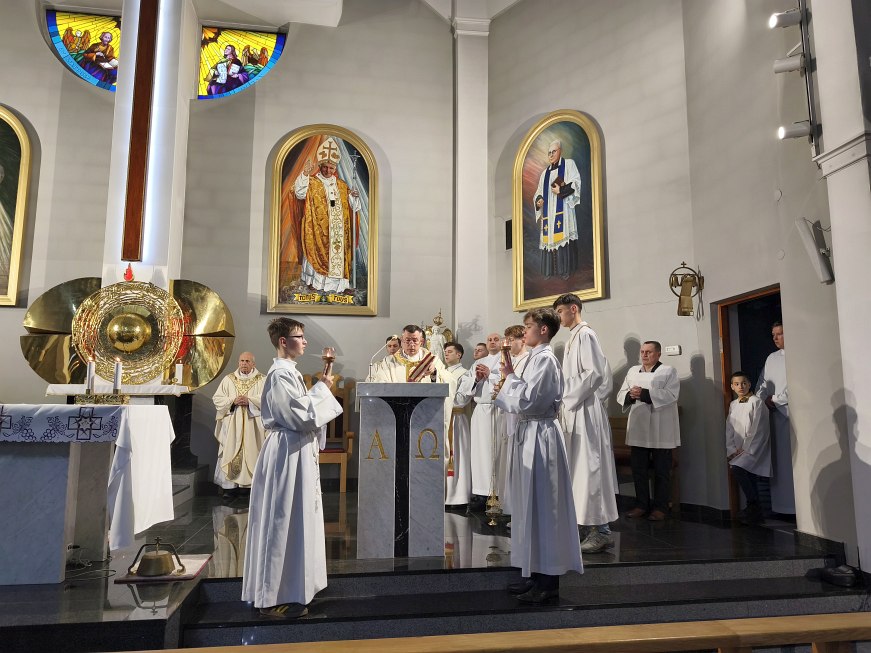 Rozpoczęliśmy dziś szczególny czas: święte Triduum Paschalne. Wielki Czwartek otwiera ten święty czas Triduum Paschalnego. Dzisiejszą Mszą Wieczerzy Pańskiej o godz. 18:00 rozpoczęliśmy Triduum Paschalne: pamiątkę Męczeństwa, Śmierci i Zmartwychwstania Pana naszego Jezusa Chrystusa. Mszę św. swoim śpiewem ubogacił występ naszego chóru kościelnego, pod kierownictwem pana organisty Michała Wojtaszka, który rok temu w Wielki Czwartek miał swój premierowy występ.