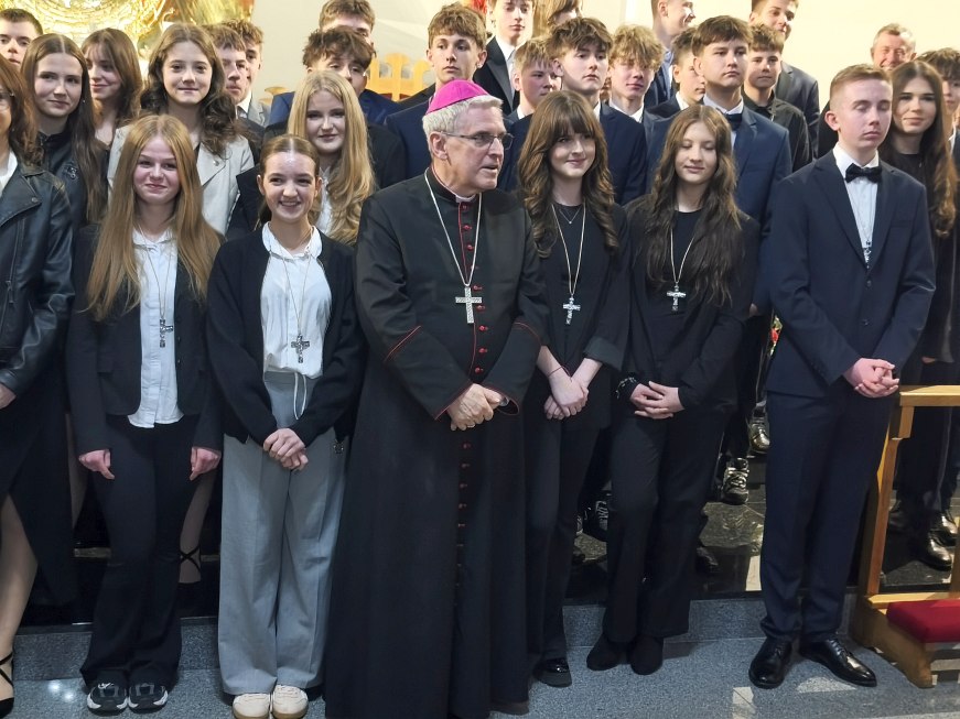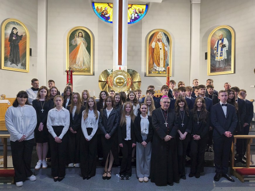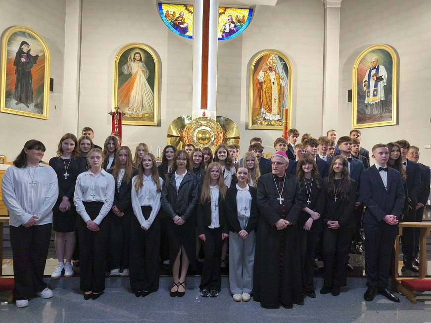 Na zakończenie uroczystości młodzież wraz z księdzem biskupem Krzysztofem Nitkiewiczem ustawiła się do pamiątkowego zdjęcia.