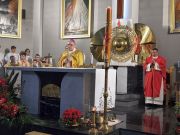 Przed homilią ksiądz proboszcz Jan Zając poprosił księdza biskupa o udzielenie 43-stu młodym osobom sakramentu bierzmowania. W wygłoszonej homilii ks. bp. Krzysztof Nitkiewicz przypomniał młodzieży kim był św. Wojciech, którego Kościół w Polsce uznaje za jednego ze swoich głównych patronów. Ksiądz biskup mówił do młodych, że św. Wojciech uczy nas tego, abyśmy potrafili się poświęcić. Żebyśmy dali z siebie wszystko. Żebyśmy nie żyli tylko dla siebie ale żebyśmy potrafili żyć dla Pana Boga i innego człowieka.