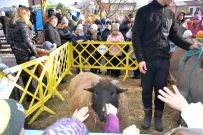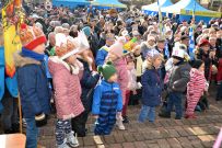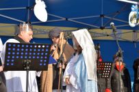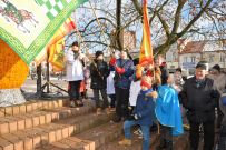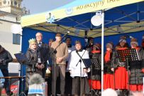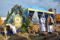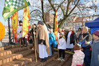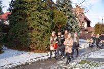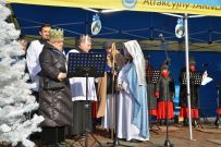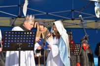 Pogoda była sprzyjająca orszakowi nie tak jak w latach poprzednich toteż kierując się w stronę Placu Bartosza Głowackiego szło się nam wesoło, ze śpiewem kolęd na ustach, wymachując chorągwiami. Tam połączyliśmy się z orszakami z parafii pod wezwaniem Świętej Barbary, Chrystusa Króla i Matki Bożej Nieustającej Pomocy. Przywitała nas organizatorka orszaku Pani Joanna Szmuc a nasz św. Józef i św. Maryja stanęli przy szopce. Ministranci i bielanki umiejscowili się po prawej stronie namiotu dzierżąc w dłoniach chorągwie. Oddaliśmy pokłon Świętej Rodzinie a ksiądz dziekan Adam Marek zawierzył miasto i mieszkańców Tarnobrzega opiece Matki Bożej Dzikowskiej. O godz. 12:00 została odmówiona modlitwa Anioł Pański i wspólne zaśpiewano kilka kolęd.
