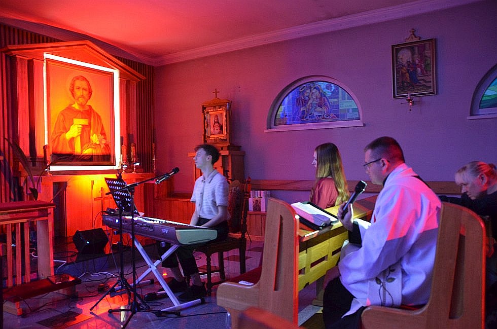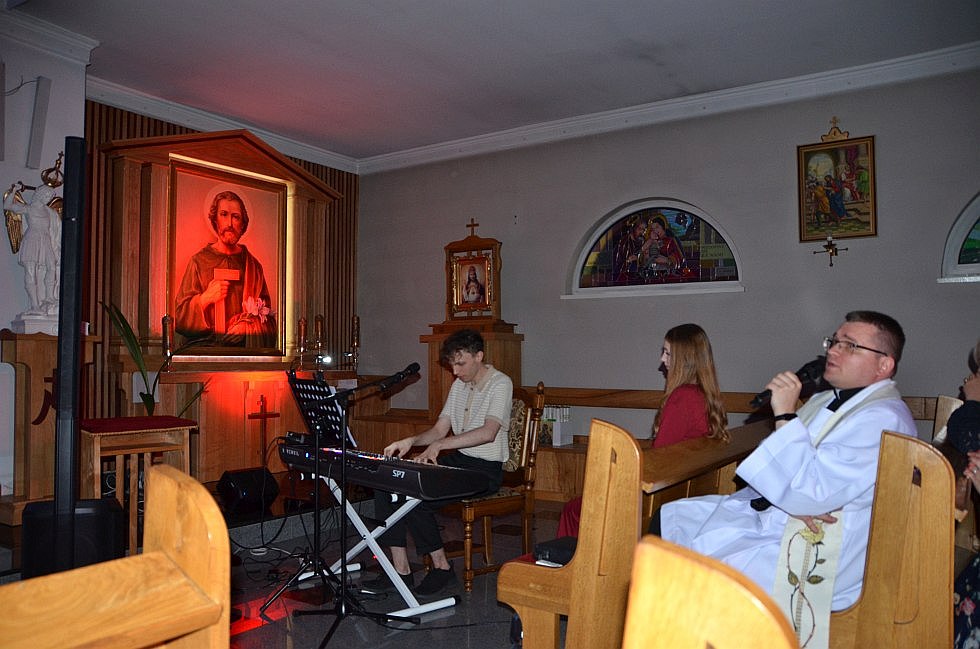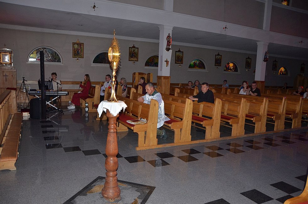 Bezpośrednio po Mszy św. został wystawiony Najświętszy Sakrament i rozpoczął się czas modlitwy, w której muzyka uwielbienia przeplatała się ze Słowem głoszonym przez księdza Krystiana. Damian, który grał na organach i śpiewał oraz Karolina, która również śpiewała stworzyli nastrój modlitewny, pełen zamyślenia, zadumy, rozmodlenia. Podczas wieczoru uwielbienia przez cały czas muzyka i śpiew mieszała się ze Słowem Bożym.