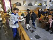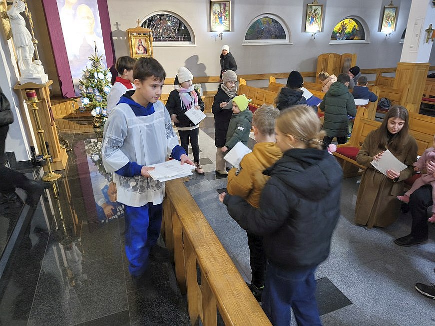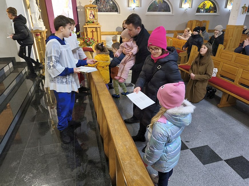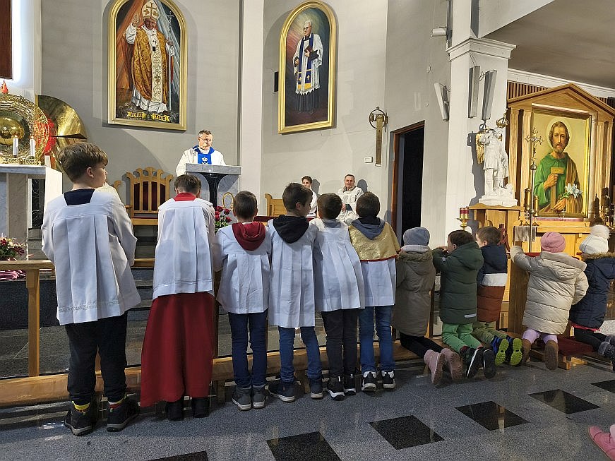 Liturgiczna Służba Ołtarza po Mszy św. rozdała dzieciom plansze, na które naklejać będą w kolejnych dniach obrazki.