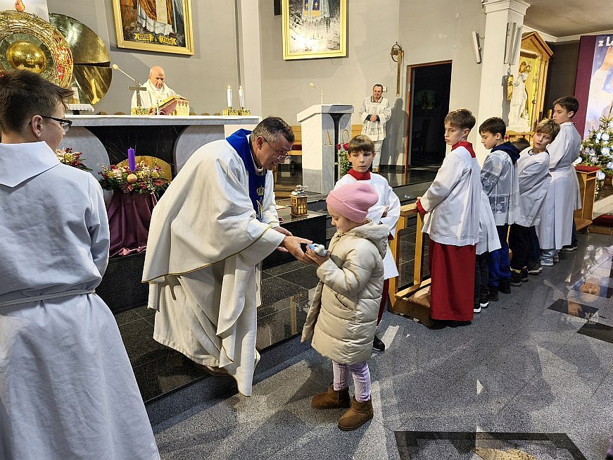 Na zakończenie Mszy św. roratniej ksiądz Stanisław Wdowiak wylosował jedno serduszko z wielu przyniesionych dzisiaj przez dzieci do kościoła i dziewczynka, która wykonała to serduszko otrzymała figurkę Matki Bożej do domu by wrócić z nią na jutrzejsze modlitewne spotkanie.