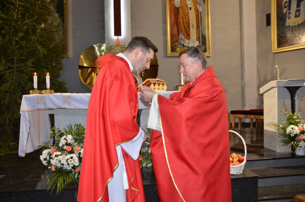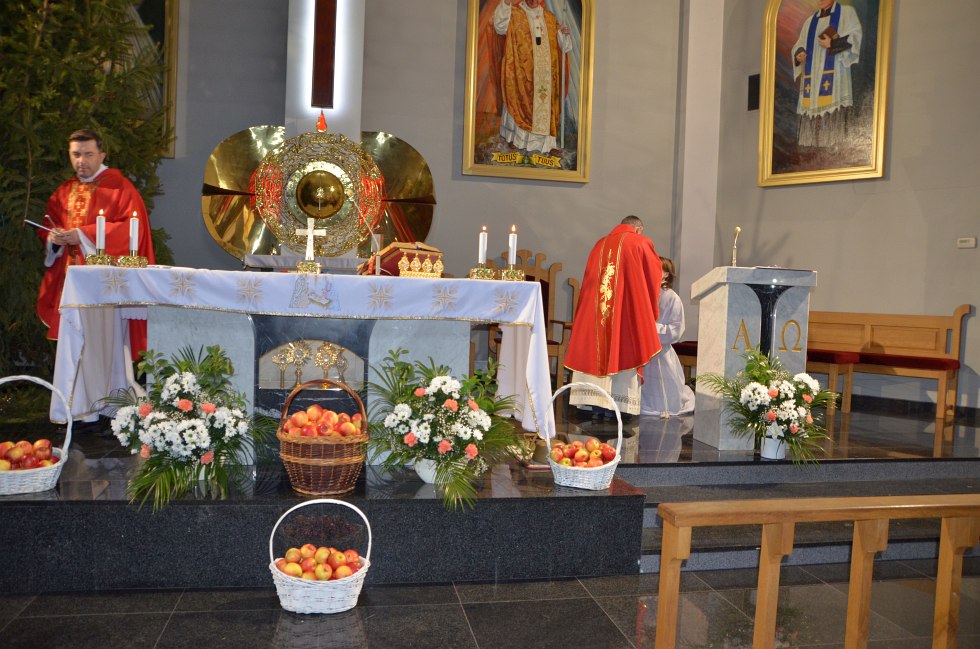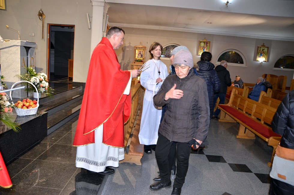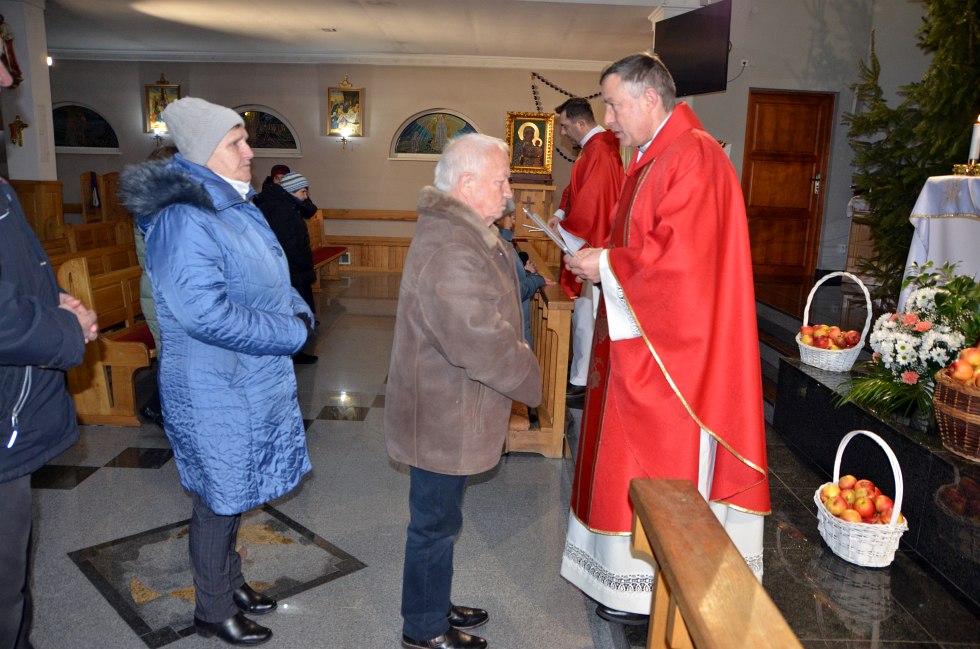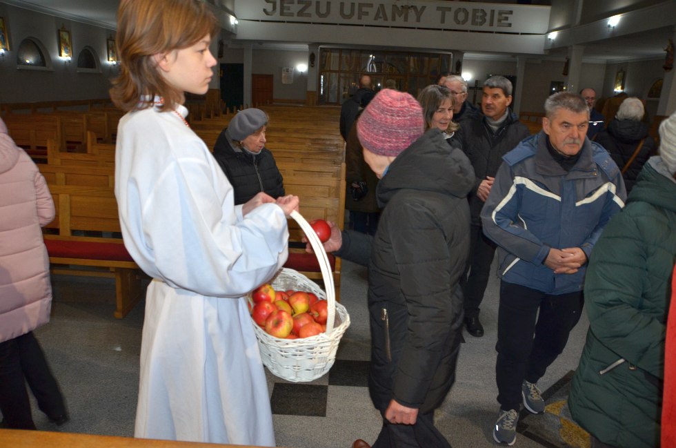 Na Mszy św. wieczornej ksiądz Wojciech najpierw poświęcił jabłka, które leżały w koszach przed ołtarzem i jabłka, które wierni przynieśli do kościoła. Zjedzenie poświęconych jabłek ma zapobiec chorobom gardła. Poświęcone w dniu św. Błażeja jabłka dawano również zwierzętom, głównie bydłu, owcom i kozom. Nazywano je jabłkami błażejkowymi i trzymano oddzielnie od innych niepoświęconych jabłek.
