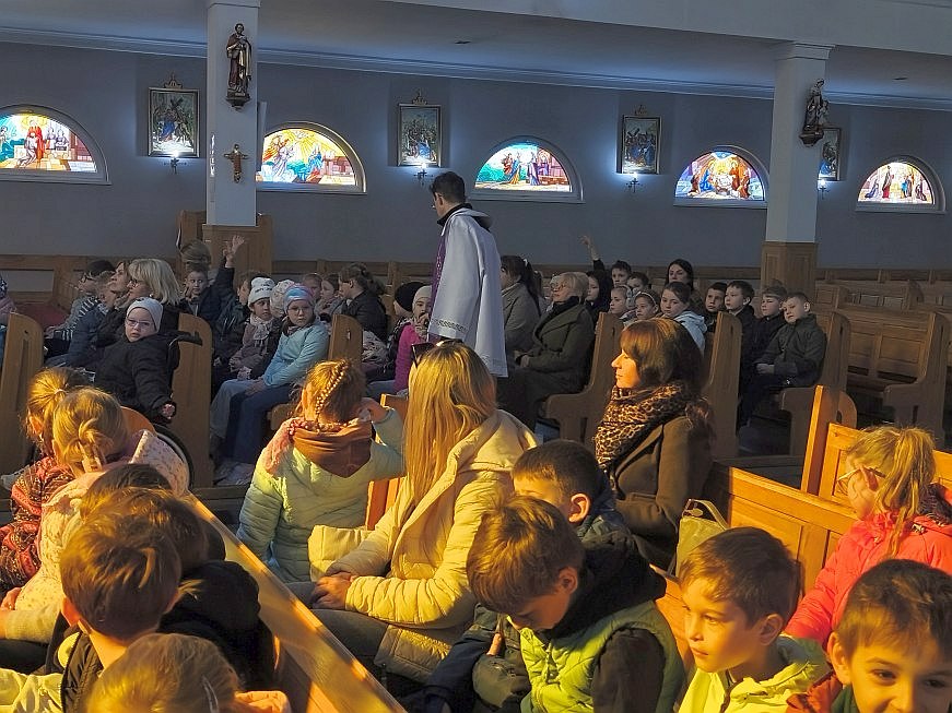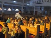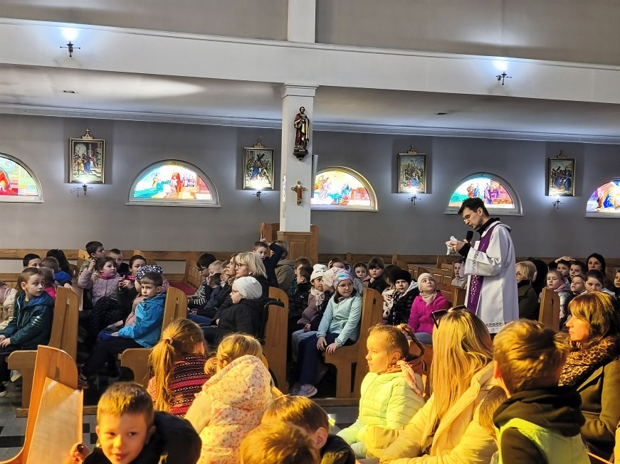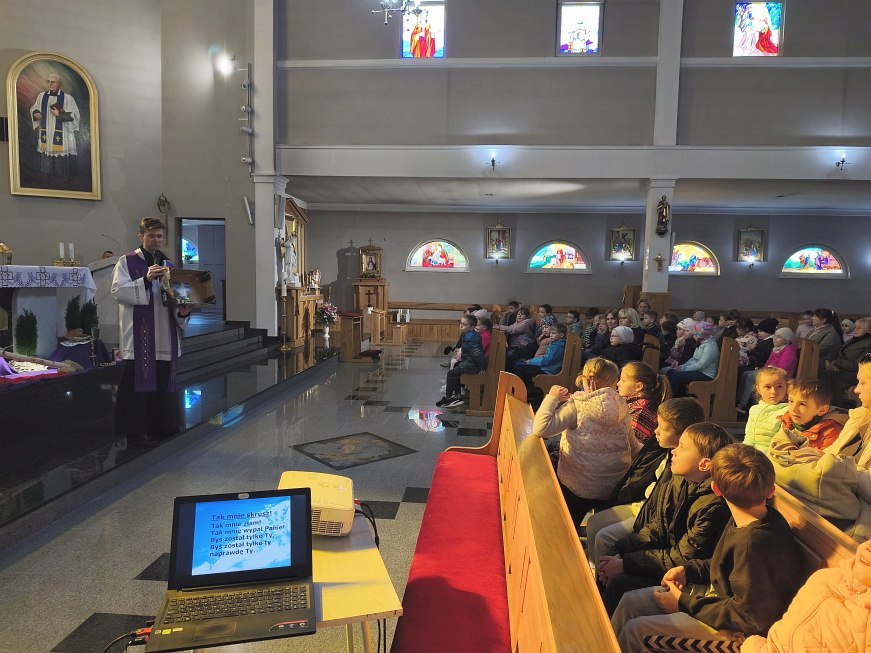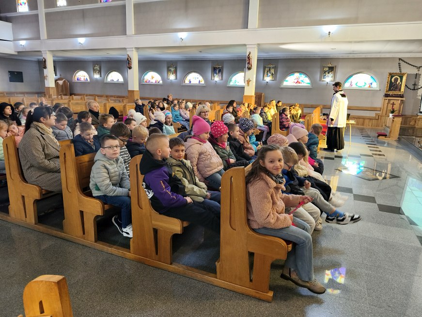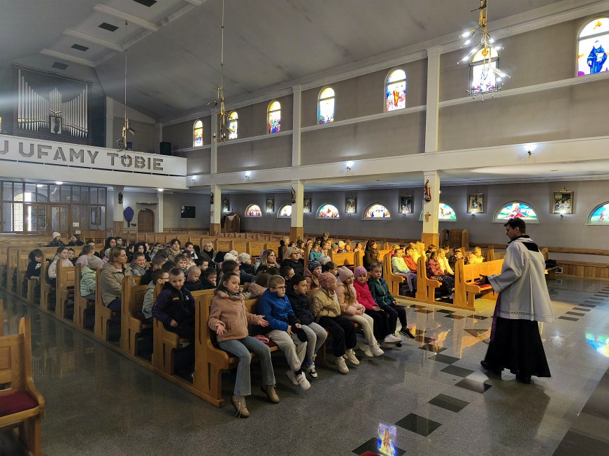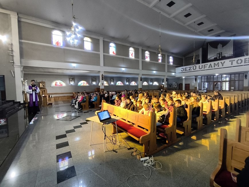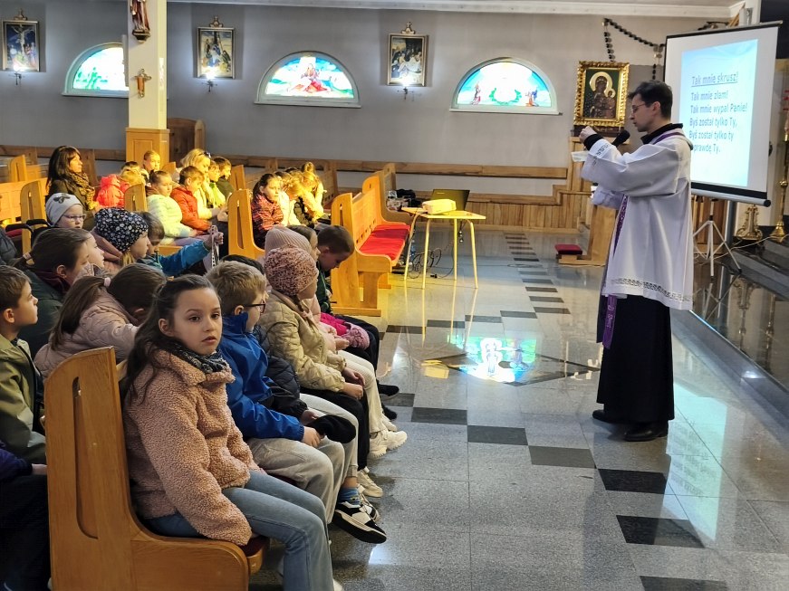 Dzieci odpowiedziały na pytanie ks. rekolekcjonisty gdzie możemy spotkać Pana Jezusa, jakie mamy sakramenty święte, kto to jest osoba święta, kto jest namalowany na obrazach wiszących w prezbiterium. Na zakończenie ks. rekolekcjonista mówił o św. Carlo Acutis – włoskim uczeniu liceum w Mediolanie, który mówił, że „Eucharystia jest moją autostradą do nieba”. Dzieci na zakończenie swojego pierwszego dnia rekolekcji wielkopostnych obejrzały krótki film o św. Carlo Acutisie.