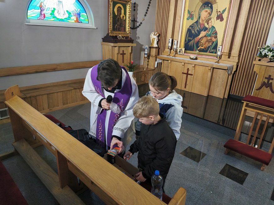 Na przykładzie kamienia i gąbki zanurzanych w wodzie, która jest jak dobro, jakie Pan Jezus, rodzice, nauczyciele lub ksiądz chcą im przekazać wyjaśnił, jak wobec tego dobra można się zachować. Można być jak kamień, który nie wchłania dobra albo jak gąbka, która wchłania wodę – wchłania dobro. Trzeba być jak gąbka, przyjmować to co nam daje ktoś, co jest dobre. Chłonąć dobro do środka i oddawać to wchłonięte dobro, dzielić się z innymi.