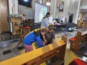 I tak jak na poprzednim spotkaniu z najmłodszymi, młodzież odpowiedziała na pytania ks. rekolekcjonisty - gdzie możemy spotkać Pana Jezusa, jakie mamy sakramenty święte, kto to jest osoba święta, kto jest namalowany na obrazach wiszących w prezbiterium.