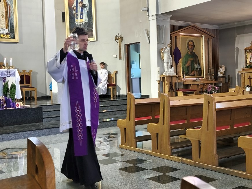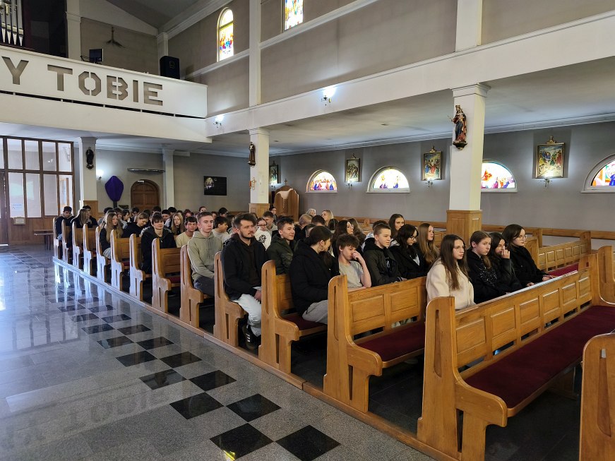 We wtorek 24 marca 2026 roku na godz. 10.00 do kościoła przyszli uczniowie klas od IV do VIII szkoły podstawowej na swoje drugie spotkanie z ks. dr Konradem Fedorowskim. Na początku spotkania ksiądz rekolekcjonista przekazał młodzieży więcej informacji o świętym Carolu Acutisie. O Jego życiu, Jego wierze, przesłaniach i wskazówkach.