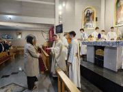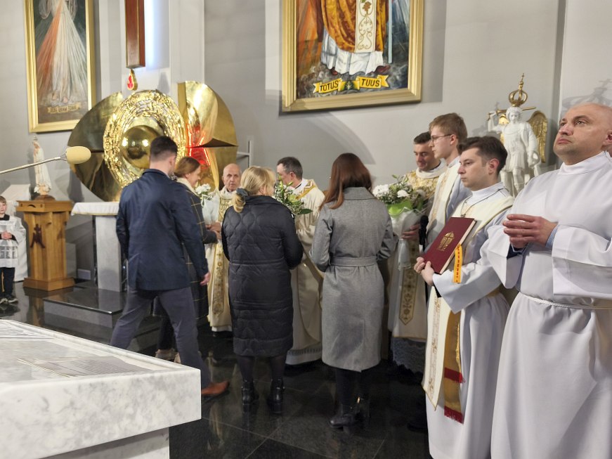 Na początku Mszy św. o godz. 18:00 przedstawiciele parafian złożyli kapłanom podziękowania za Ich codzienną posługę i złożyli Im życzenia wielu łask Bożych, opieki Matki Bożej, zdrowia i błogosławieństwa Bożego. Każdy z kapłanów otrzymał wiązankę pięknych białych róż.