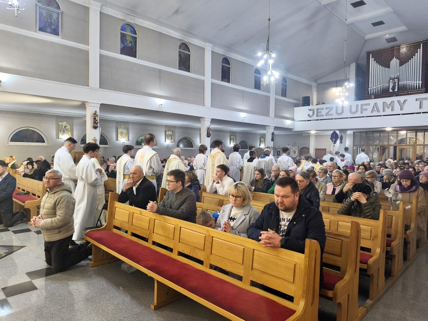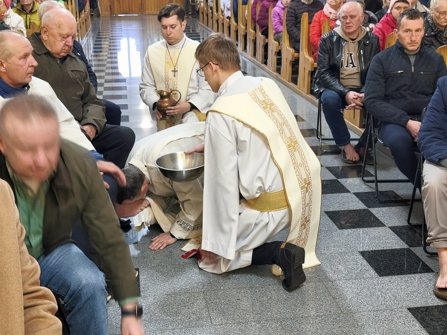 W Wielki Czwartek Jezus pozostawił nam nowe przykazanie miłości: „Miłujcie się wzajemnie, jak Ja was umiłowałem”. Bardzo ważny i pełen pokory w czasie Mszy Wieczerzy Pańskiej był gest umycia nóg 12 mężczyznom przez księdza proboszcza Jana tak jak Jezus umył nogi Apostołom. Był to gest miłości, miłości do końca! Bo umycie nóg nie jest tylko gestem pokory, ale konkretną szkołą miłości – miłości, która staje się służbą wobec drugiego człowieka: w domu, w rodzinie, we wspólnocie, wobec słabych, chorych i potrzebujących.