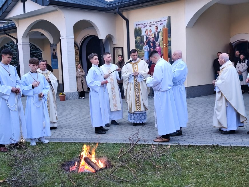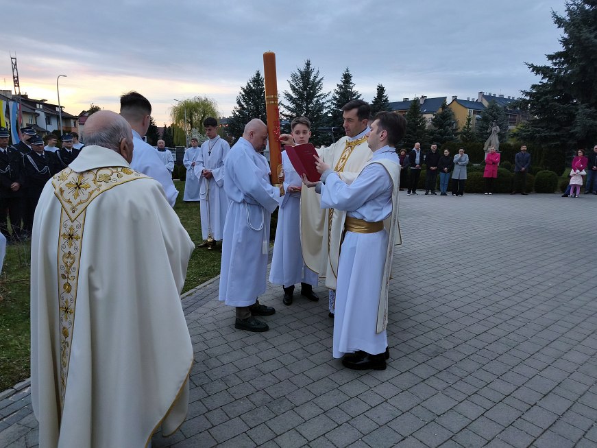 Ksiądz Wojciech żłobił na paschale rylcem krzyż, a nad nim grecką literę alfa, pod krzyżem literę omega, a na czterech polach między ramionami krzyża cyfry bieżącego roku. Jednocześnie głośno mówiąc: „Chrystus wczoraj i dziś. Początek i koniec. Alfa i Omega. Do Niego należy czas i wieczność. Jemu chwała i panowanie”. Następnie procesja weszła do ciemnego kościoła uroczyście wnosząc paschał do świątyni z trzykrotnym oznajmieniem: Światło Chrystusa.