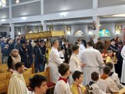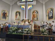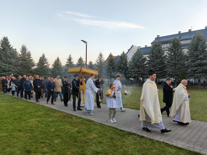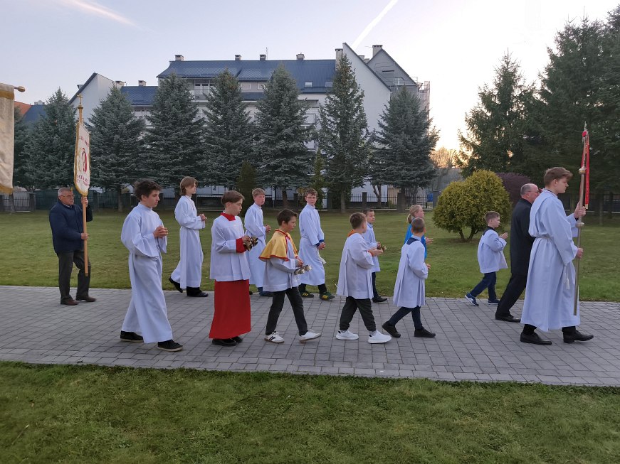 Asystujący głównemu celebransowi nieśli figurkę Jezusa Zmartwychwstałego oraz krzyż owinięty czerwoną stułą. Cała procesja - księża, ministranci oraz wierni trzykrotnie okrążyli nasz kościół. W tym czasie słychać było głośne bicie dzwonów i śpiewane były wielkanocne pieśni. Po procesji wszyscy weszli do świątyni, gdzie nastąpiło uroczyste odśpiewanie Te Deum - hymnu, znanego również pod nazwą Ciebie Boga wysławiamy. Na koniec uroczystości ksiądz celebrans pobłogosławił wiernych Najświętszym Sakramentem.