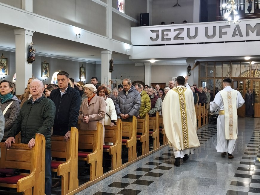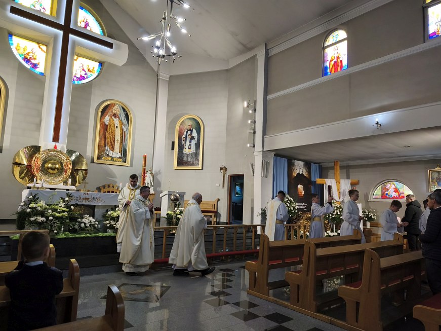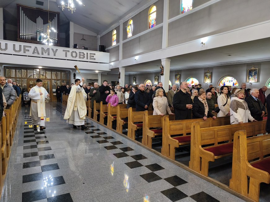 Ksiądz Wojciech, który przewodniczył Mszy św. uroczyście pokropił kapłanów, Liturgiczną Służbę Ołtarza a następnie wiernych przechodząc przez środek kościoła wodą święconą, nawiązując do symboliki chrztu i oczyszczenia. Pokropienie wodą święconą jest też znakiem odnowienia przyrzeczeń chrzcielnych oraz radosnego świętowania Zmartwychwstania.