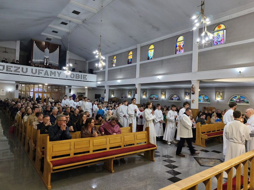 Rozpoczęliśmy dziś szczególny czas: święte Triduum Paschalne. Wielki Czwartek otwiera ten święty czas Triduum Paschalnego. Dzisiejszą Mszą Wieczerzy Pańskiej o godz. 18:00 rozpoczęliśmy Triduum Paschalne: pamiątkę Męczeństwa, Śmierci i Zmartwychwstania Pana naszego Jezusa Chrystusa. Mszę św. swoim śpiewem ubogacił występ naszego chóru kościelnego, pod kierownictwem pana organisty Michała Wojtaszka, który rok temu w Wielki Czwartek miał swój premierowy występ.