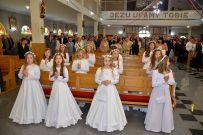 W drugą niedzielę miesiąca maja, w dniu 11 maja 2025 r. 36. dzieci z klas trzecich szkoły podstawowej na Mszy św. o godz. 11:30 przystąpiło do Pierwszej Komunii świętej. Na spotkanie z dziećmi, które wraz z rodzicami i rodzicami chrzestnymi czekały przed głównym wejściem do kościoła wyszli księża posługujący w naszej świątyni w asyście Liturgicznej Służby Ołtarza