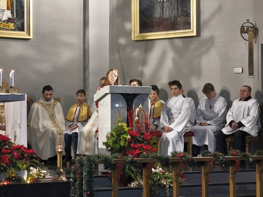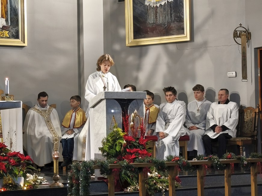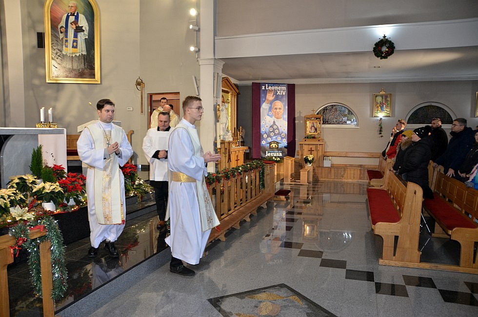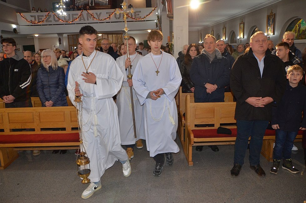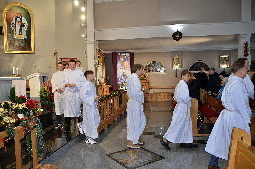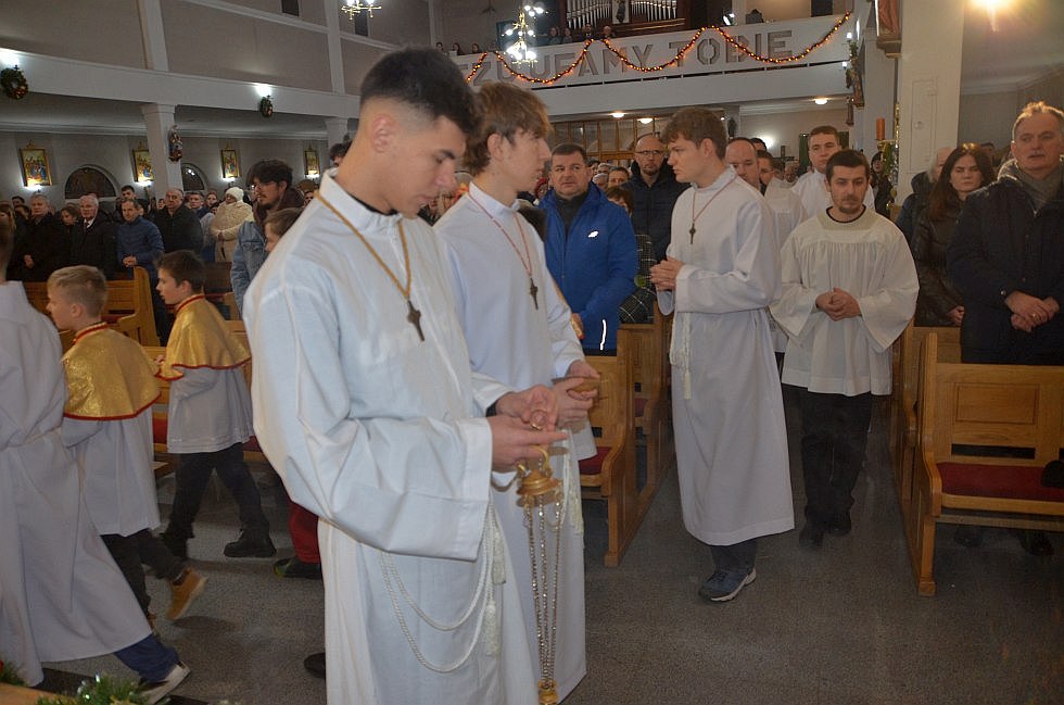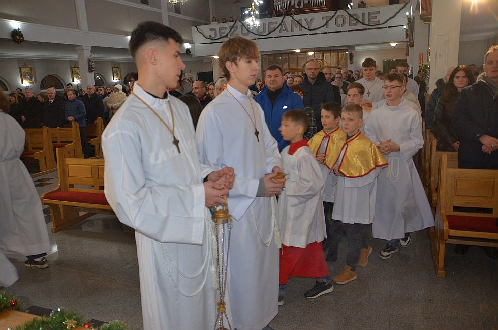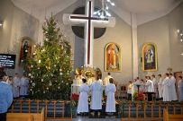 Przed Mszą św. ksiądz proboszcz uroczyście w procesji zaniósł Dzieciątko Jezus do żłóbka, który znajduje się w naszej ruchomej szopce Podczas tego nabożeństwa, tak jak przed wiekami pasterze i królowie oczekiwaliśmy na narodziny Jezusa. Radosny śpiew kolęd towarzyszył uroczystej liturgii, która co roku przypomina o radości skromnych pasterzy, którzy pierwsi spotkali Narodzonego Jezusa.