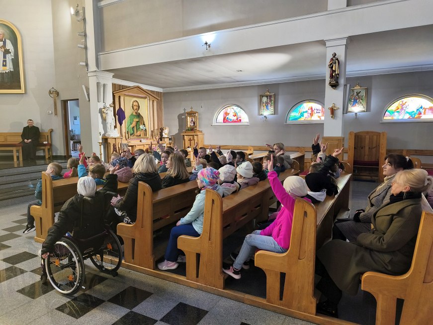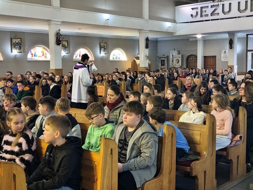 Dzieci odpowiedziały na pytanie ks. rekolekcjonisty gdzie możemy spotkać Pana Jezusa, jakie mamy sakramenty święte, kto to jest osoba święta, kto jest namalowany na obrazach wiszących w prezbiterium. Na zakończenie ks. rekolekcjonista mówił o św. Carlo Acutis – włoskim uczeniu liceum w Mediolanie, który mówił, że „Eucharystia jest moją autostradą do nieba”. Dzieci na zakończenie swojego pierwszego dnia rekolekcji wielkopostnych obejrzały krótki film o św. Carlo Acutisie.