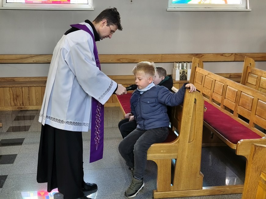 We wtorek 24 marca 2026 roku na godz. 9.00 do kościoła przyszli uczniowie klas od I do III na swoje drugie spotkanie z ks. dr Konradem Fedorowskim – rekolekcjonistą. Na początku spotkania ksiądz sprawdził, co dzieci zapamiętały ze spotkania w dniu wczorajszym. I okazało się, że zapamiętały wszystko. Dalej rozważano jak być uczniem Pana Jezusa omawiając postać świętego Carlo Acutisa.
