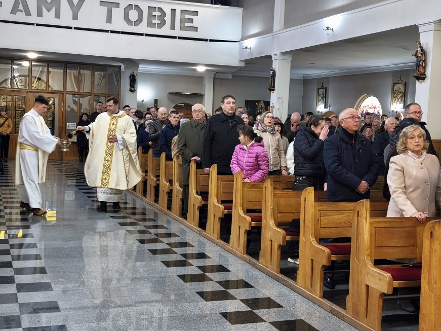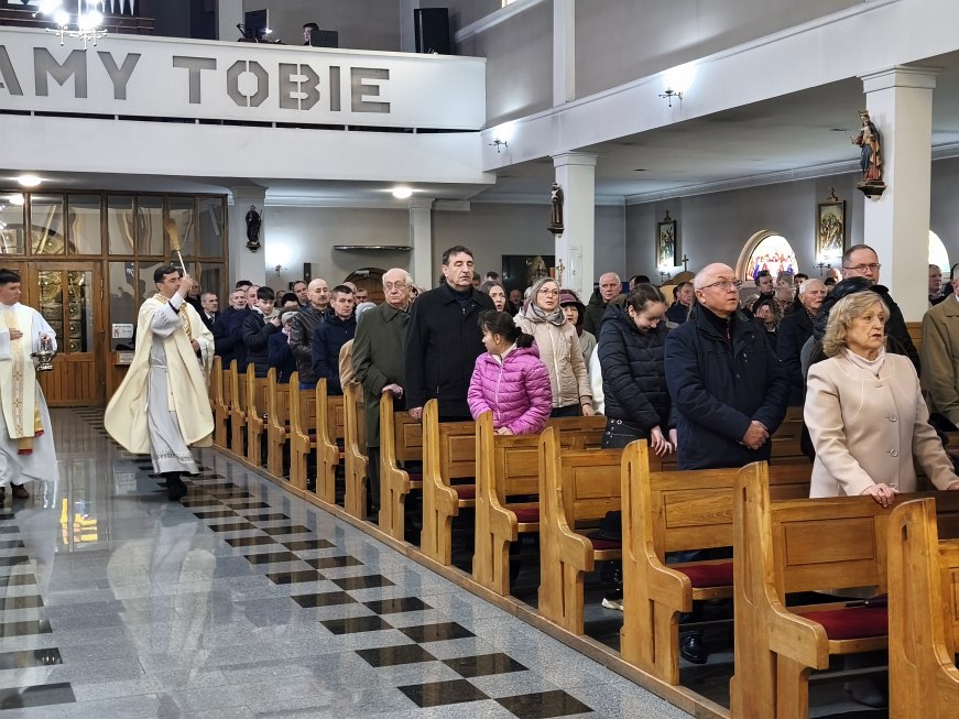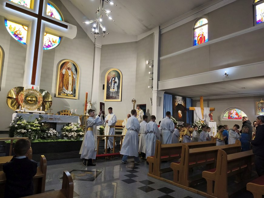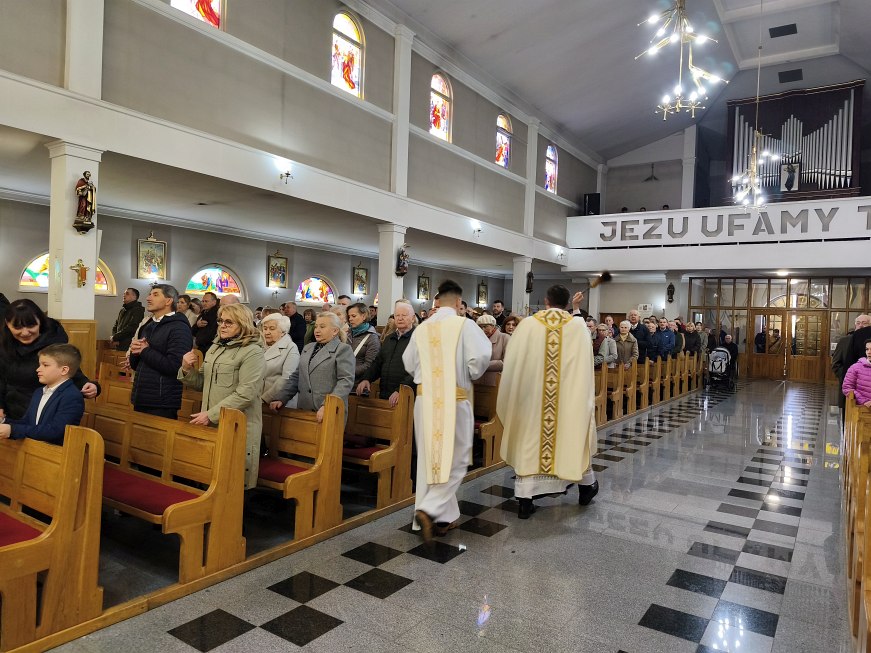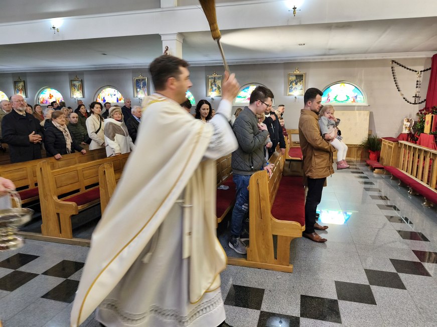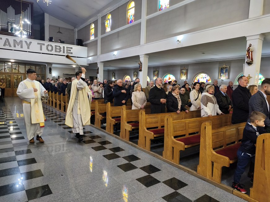 Ksiądz Wojciech, który przewodniczył Mszy św. uroczyście pokropił kapłanów, Liturgiczną Służbę Ołtarza a następnie wiernych przechodząc przez środek kościoła wodą święconą, nawiązując do symboliki chrztu i oczyszczenia. Pokropienie wodą święconą jest też znakiem odnowienia przyrzeczeń chrzcielnych oraz radosnego świętowania Zmartwychwstania.