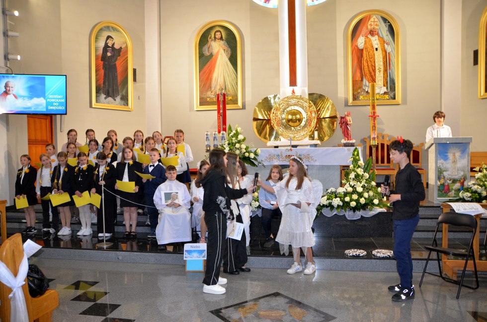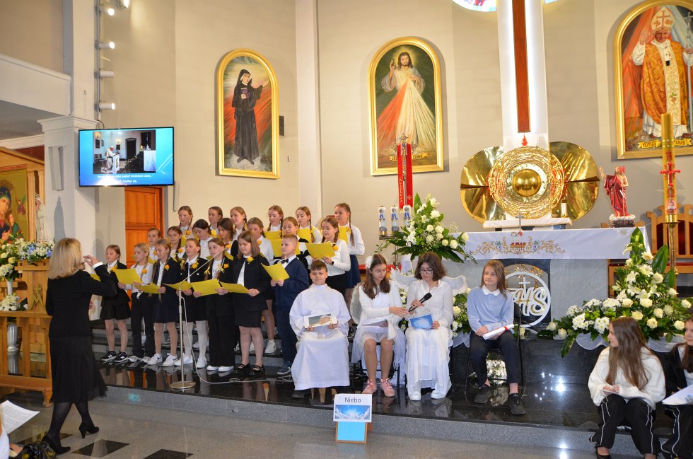 Po Mszy św. uczniowie w spektaklu słowno-muzycznym przypomnieli sylwetkę naszego wielkiego rodaka papieża Jana Pawła II. Kilka pieśni pięknie zaśpiewał chór szkolny. Po Mszy św. wszyscy udali się na teren szkoły by tam pod pomnikiem patrona szkoły papieża Jana Pawła II złożyć wiązankę kwiatów.